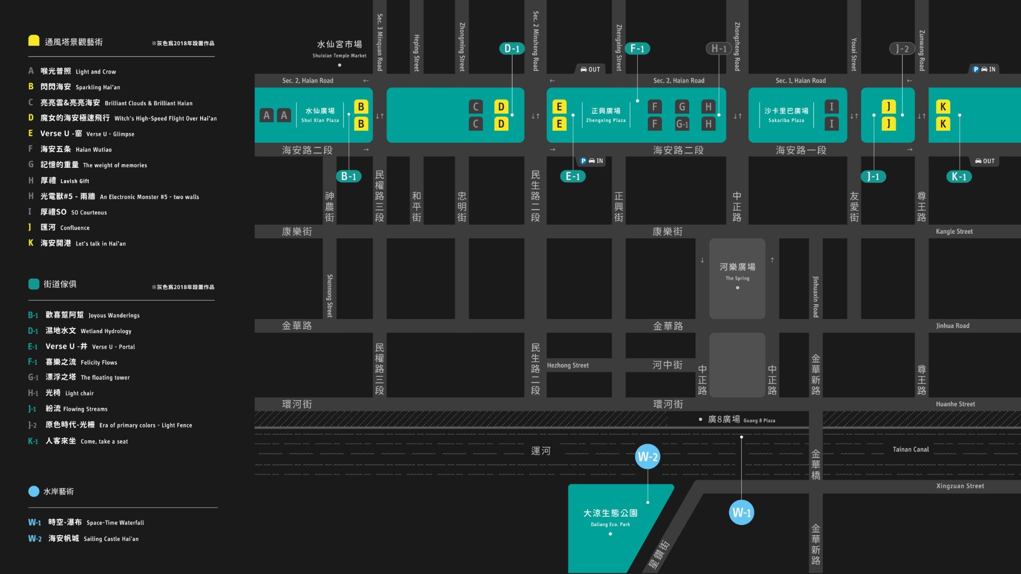 This expansion infused with river and harbor elements, guides visitor along the main storyline of the city through sail shadows, ship whistles, and hydrology. It leads them from the alleyways and ancient wells into Tainan ’s unique slow-paced lifestyle; then from Hai ’an Road towards the canal, outlining the city ’s future trajectory. The exhibition locations of artworks stretch from the reclaimed Hai ’an Road to “The Spring” Square and Daliang Ecological Park, both of which are adjacent to the riverside. People ’s footsteps and perspectives can transition from historical water sites to the actual riverside alongside the artworks.