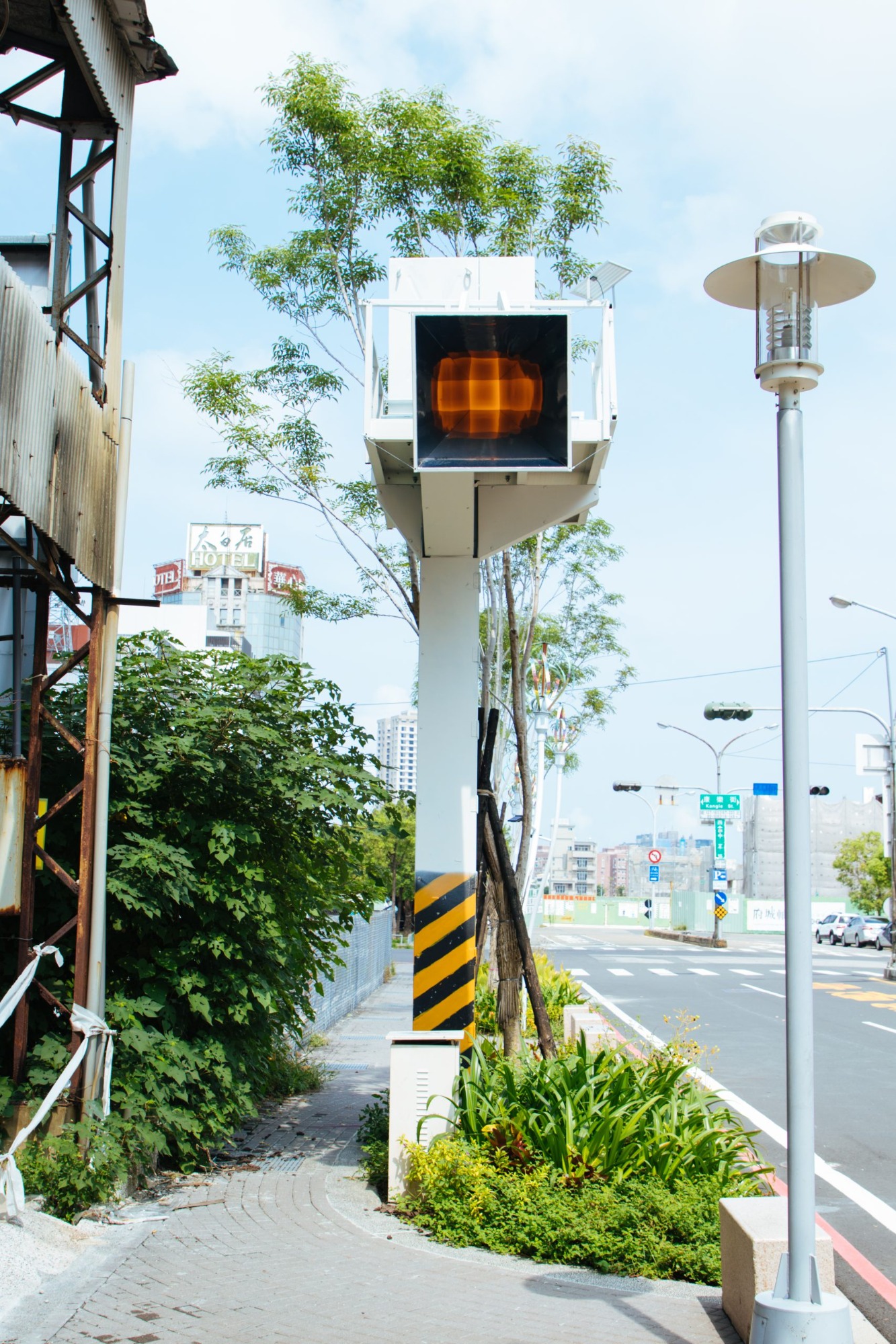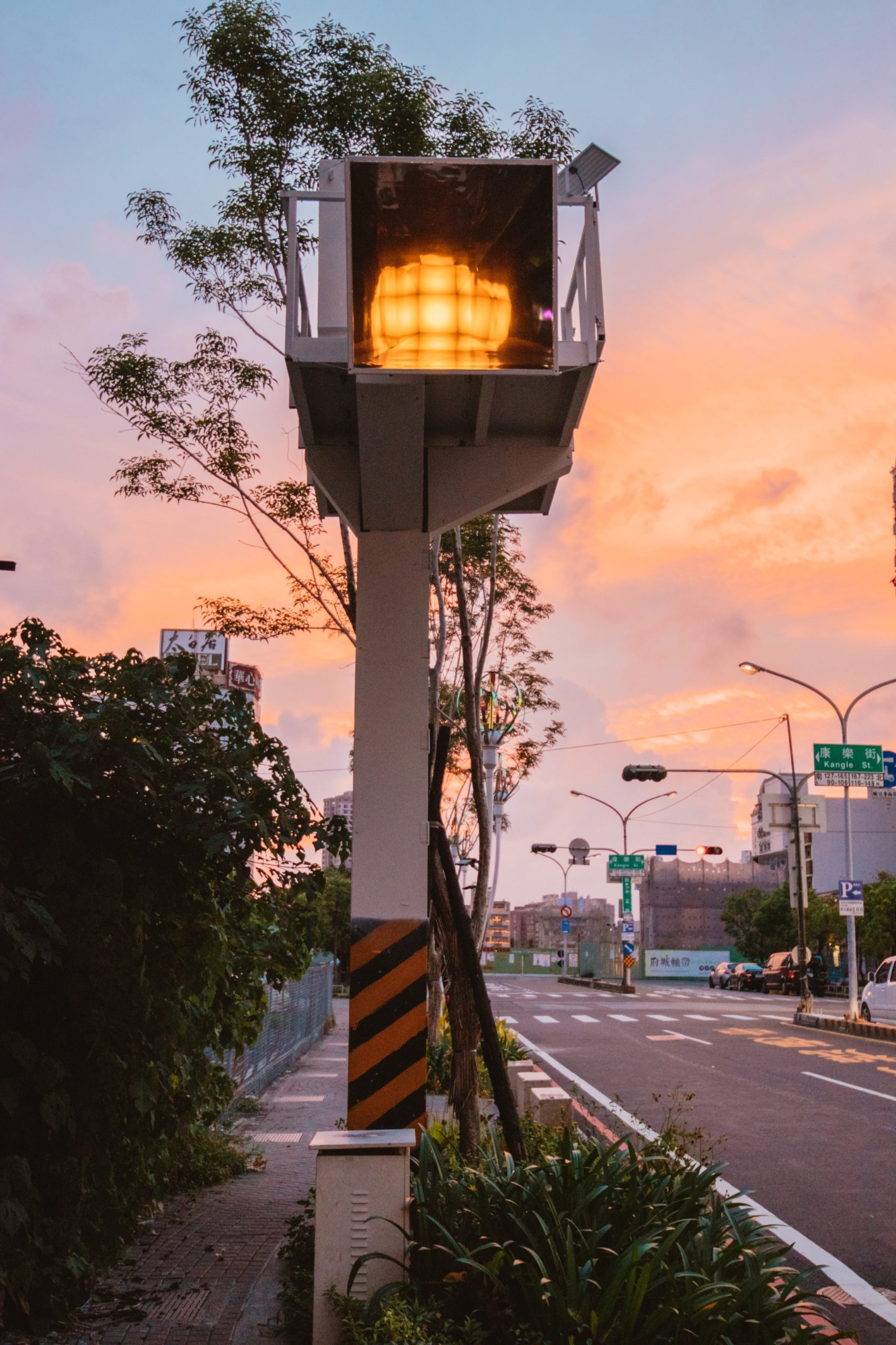 “The Sun never Sets” utilizes refraction and illusion to turn light into a sphere. Solar energy is used to power the work, hoping to create a series of never-setting suns, leading towards the canal and along the street, with its many signs and busy traffic. Thus the nearby area can once again transform into a thriving and prosperous corridor.