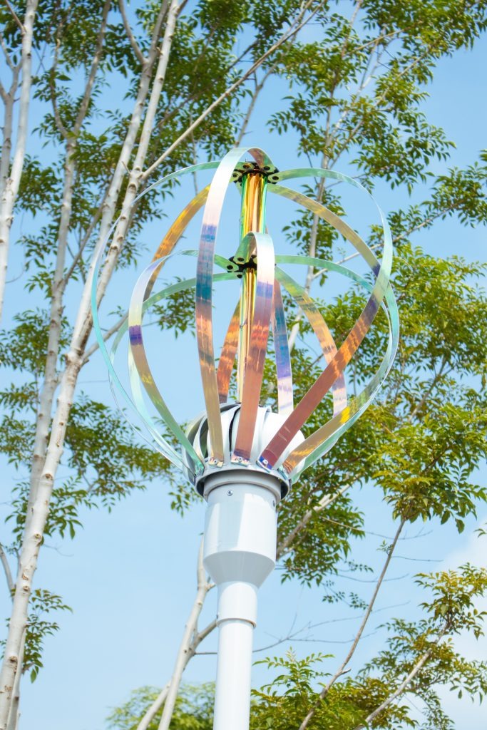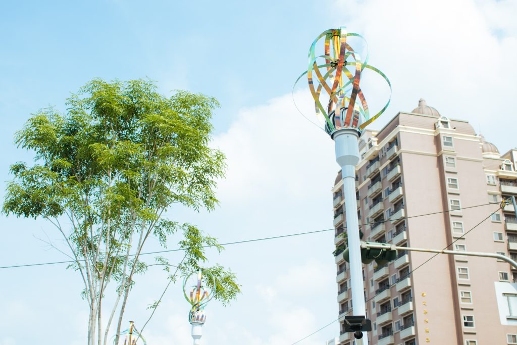 Tree-like artworks are installed in the parterre, creating a party vibe along the street. The wind kinetic spheres at the tips of the tree branches are made of colorful woven metals, which move with the wind and create joyous and dreamy visual effects – a gift for this city.