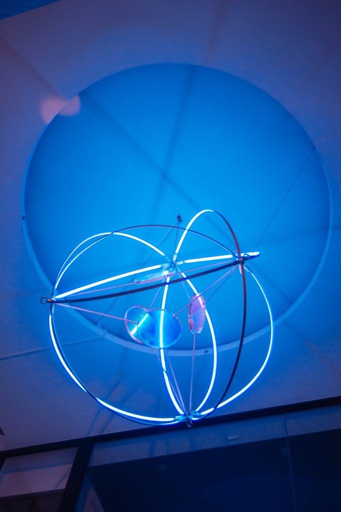 The ring-shaped tension structures represent the moon; as time goes by, the moon changes its shape and so does the world. Symbolizing the push and pull of time and space from the past into present, the tension structures inherit the past, explore the future, and connect all parts of the world. They are boundless and endless. The four circles that stretch outward from the geometric structure of a cube intersect and interact with their respective halves.