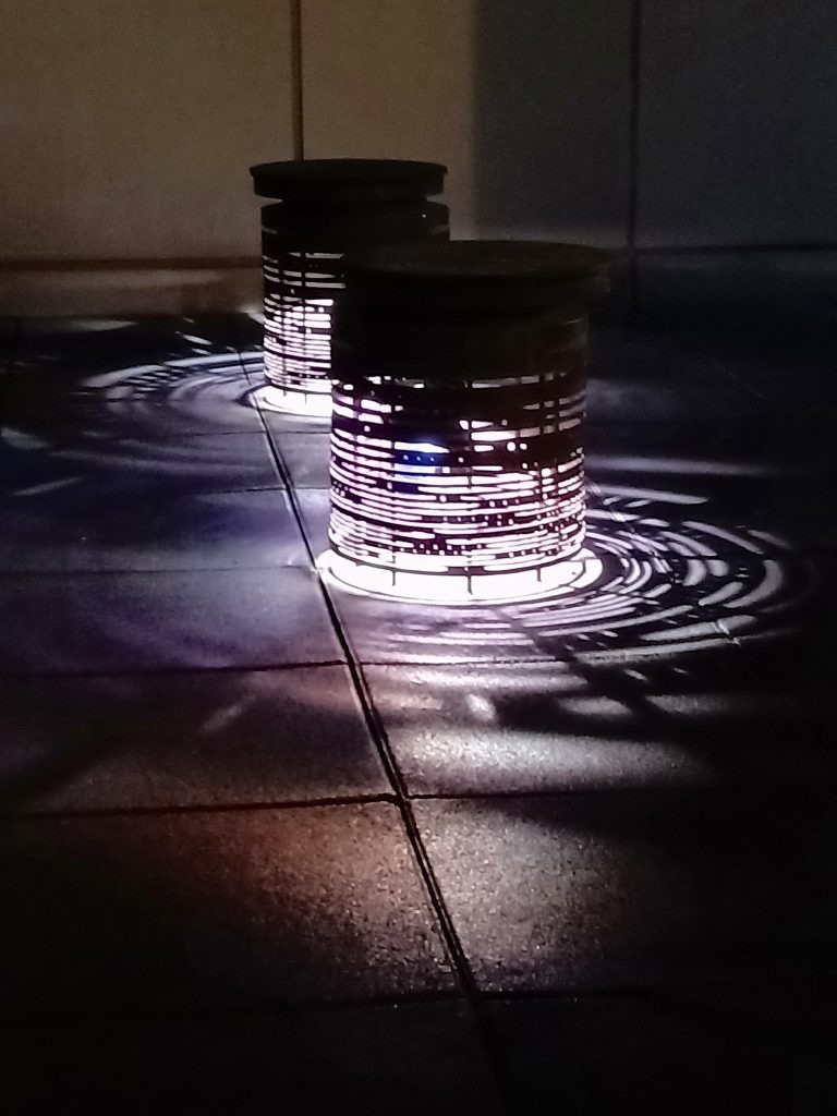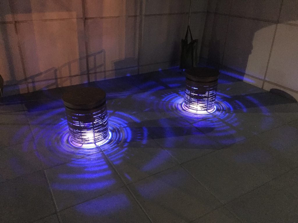 この作品はインタラクティブタイプの照明装置です。参加者は椅子のような装置に座ります。小船に乗った気分で、バランスを取りながら装置を動かすと、光と影が出ます。その光と影は水面の波のように、ゆらゆらとしています。