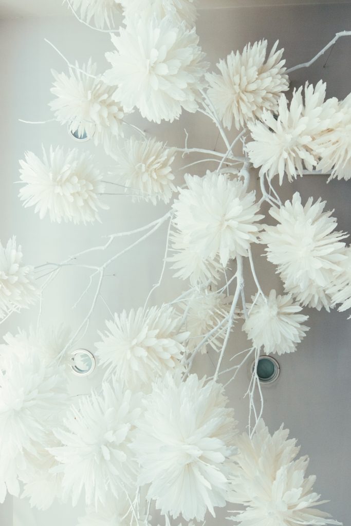 The artist utilizes the texture of feathers to remind us that some types of natural scenery are overlooked due to peoples sensitivity towards nature. To the artist, white feathers seem like clouds. They transform clouds, giving them a beautiful and glamorous appearance. Feathers, sky, and clouds are all metaphors of “beauty.” “Cloudy Beauty” references Li Bo’s poem, “Song of Purity and Peace,” which describes the beauty of Yang Yuhuan, and echoes fashion designers’ intentions to convey the idea of “beauty” to people.