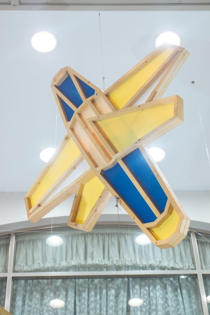 吹き抜け空間にぶら下げてた作品があり、それらは色鮮やな布で色彩られている。展示場所の布に合わせデザインである。