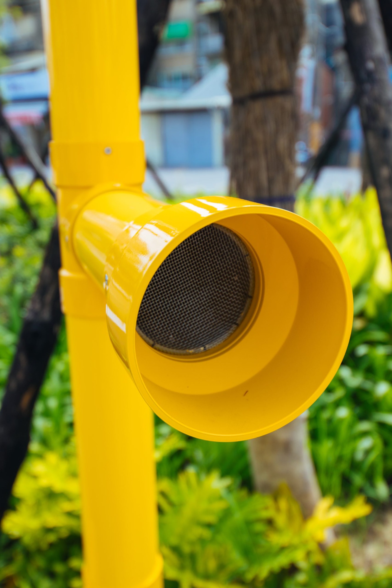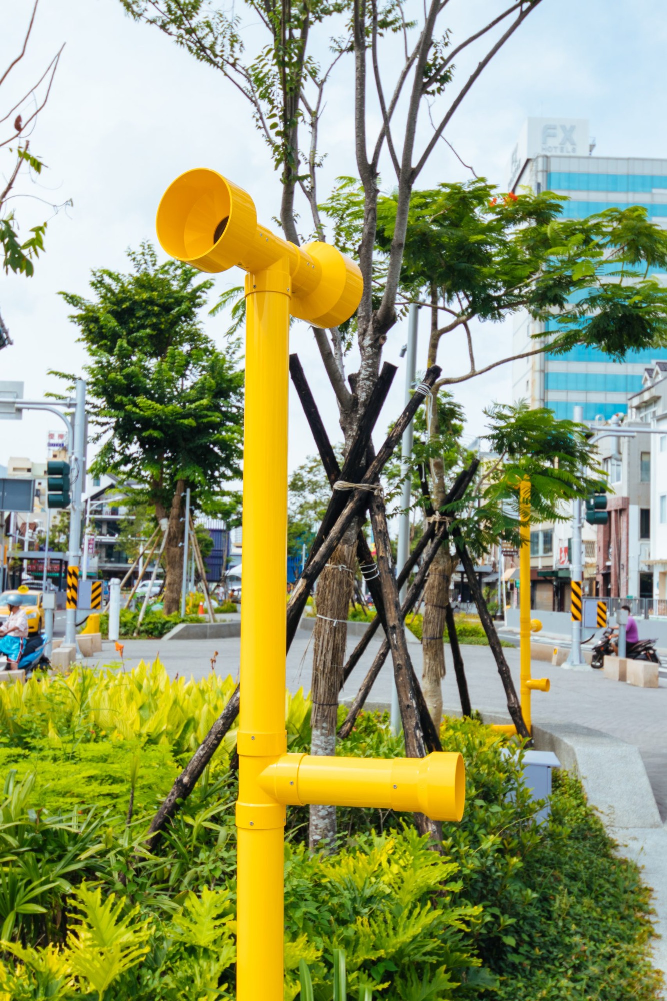 Two metal tubes are erected to broadcast swallow and cicada chirps in order to create a serene experience. The work transforms normal sounds into interesting experiences. A normal day is not only normal; a normal day can be interesting.