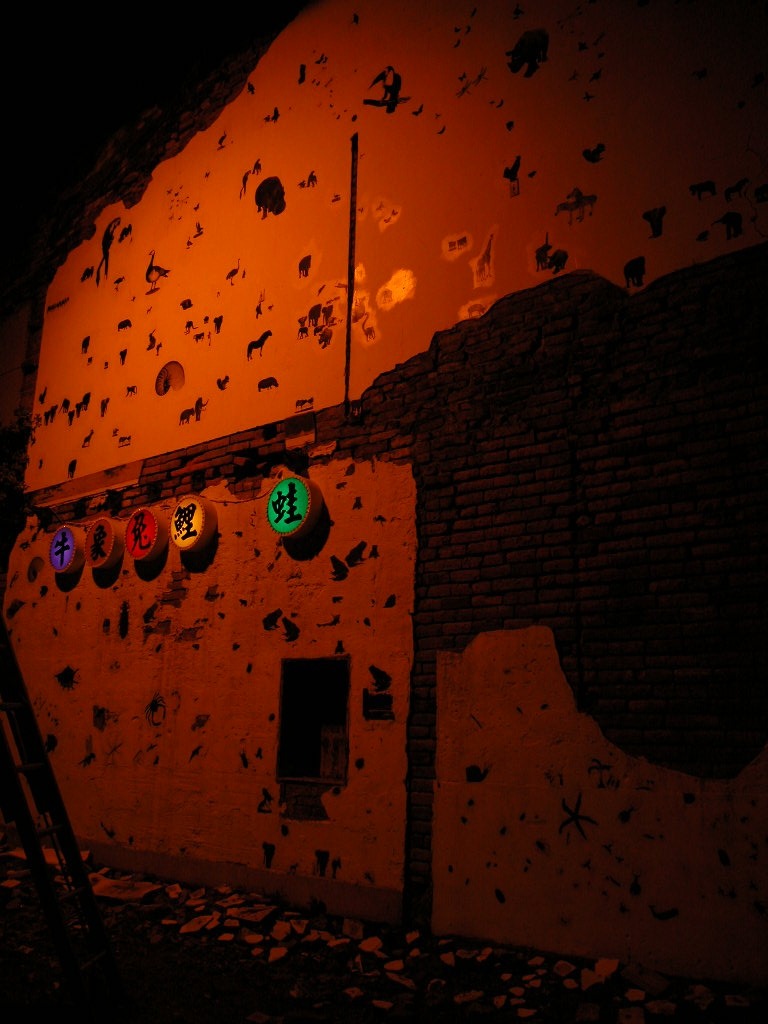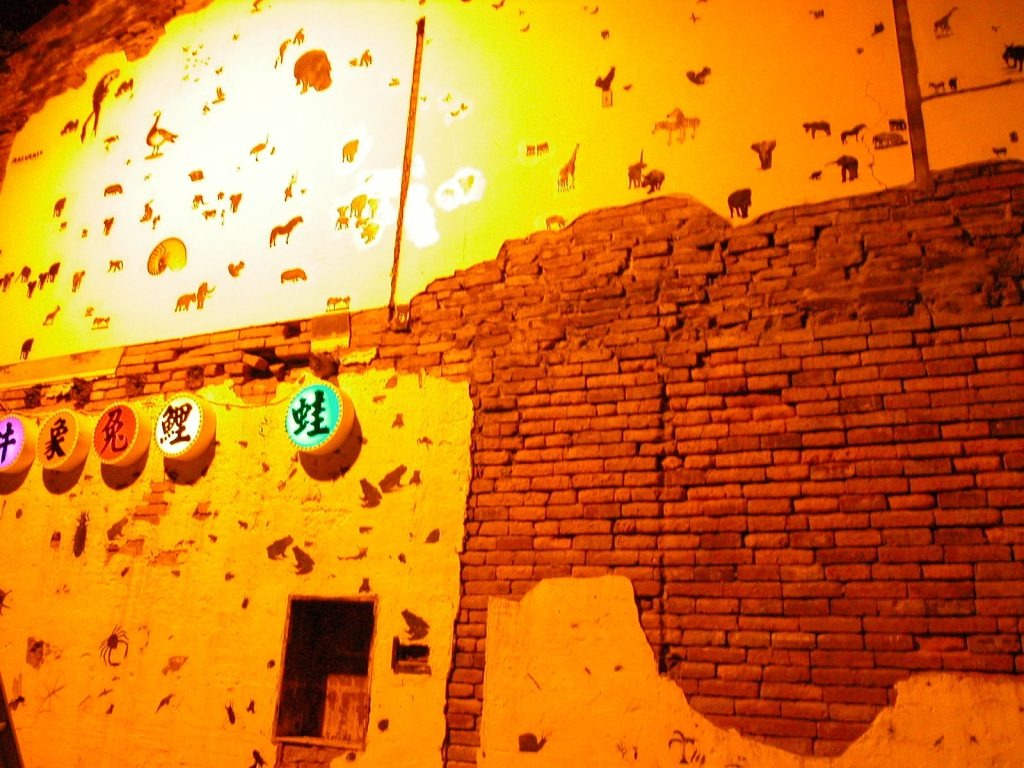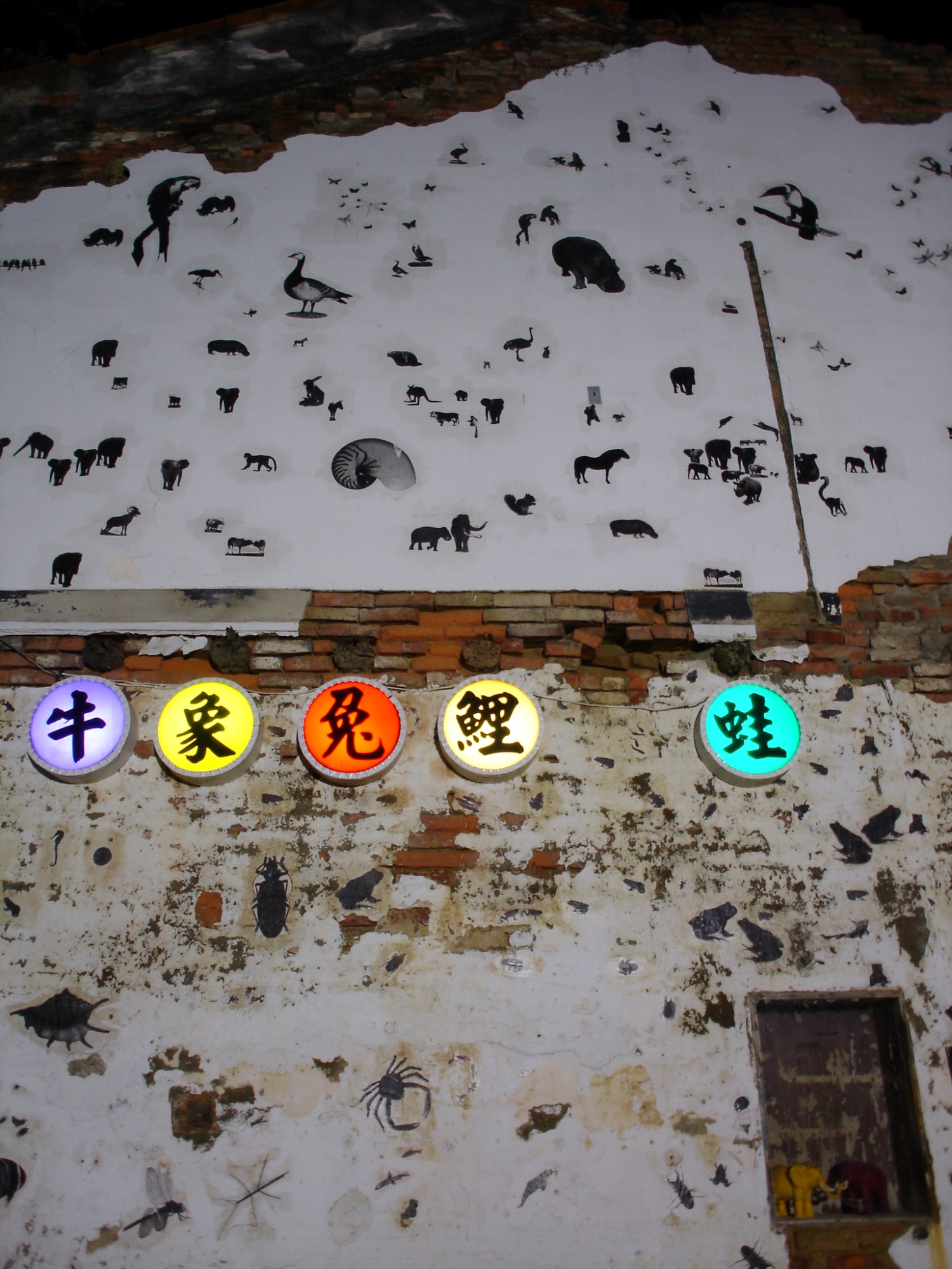 「生態物語」是資深藝術家盧明德以各式生態哺乳動物、鳥類及昆蟲等百餘張圖像,轉印在剝落老舊的牆垣高處。其意指多樣的集結,來凸顯「物種實驗」的遺傳、胚胎、發育、生殖、生長…等,種種生生不息的大千世界。面對海安路的未來發展,也如同千變萬化的世界,希望能兼具在多元化與趣味性融合下而生。藝術家要民眾猜猜看,這牆上集結了多少物種?曾為五條港區之一的南勢港(今神農街),在過去曾為漁貨販售地,現今的水仙宮市場仍販售著新鮮的海產。圖像中蛙、鯉、兔、象、牛等,以標題帶些閩南音韻點出該地區的地域特性與環境典故。